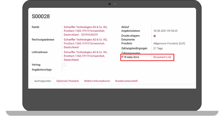 Every report that has been configured for automatic upload is deposited in the respective folder without any additional action. The link to ITISeasy.docs is automatically generated and attached to the offer/order/invoice. Here, a sales contract (SO0028) was uploaded to ITISeasy.docs.